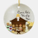 El inspirador adorno navideño personalizado de la natividad muestra el saludo: 'Ven, venerémosle'. La parte de atrás del adorno tiene la Biblia Verse Mateo 2:2, "¿Dónde está el que ha nacido Rey de los judíos? Porque hemos visto Su estrella en el Este y hemos venido a adorarle. También un Navidad saluda con nombre y fecha que puede ser personalizado con los detalles de su elección.-