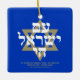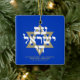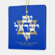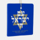 Am Yisrael Chai texto en blanco hebreo con un texto personalizado personalizado en oro falso y una estrella de oro falso de David sobre fondo azul en un lado de adorno. Bandera israelí al otro lado de la adorno. Disponible en muchas formas y materiales. Am Yisrael Chai, El pueblo de Israel vive, la nación de Israel vive es un himno de solidaridad judío y una expresión ampliamente usada de la población judía. El texto es totalmente personalizable. Estos son grandiosos como regalos y favores de Hanukkah.