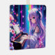 Ornamento navideño con temática de anime personalizado. chica de anime bonito tocando el piano rodeado de estrellas y flores de color morado, azul y rosa.