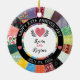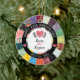 Este ornamento personalizado ofrece una frontera bonita modelada para parecer un edredón de remiendo cosido y lee aniversario feliz alrededor del borde. Modifiqúelo para requisitos particulares para una novia y un novio especiales incluyendo sus nombres, y usted puede cambiar el número de la fecha y del aniversario del boda alrededor del centro. Los corazones rosados y una variedad de modelos florales, del punto y de la raya coloridos añaden una sensación acogedora del país.