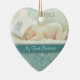 Este adorno de manga de vacaciones incluye su propia fotografía de bebé, con un borde inferior de un elegante remolino floral azul acuático. Un cartel verde azulado más oscuro sostiene tu texto personalizado; ¡hazlo decir lo que quieras! La parte posterior del ornamento tiene el mismo patrón de giro floral acuático y una bandera verde azulada con texto adicional. Esto hace un buen regalo de mantenimiento para los nuevos padres.