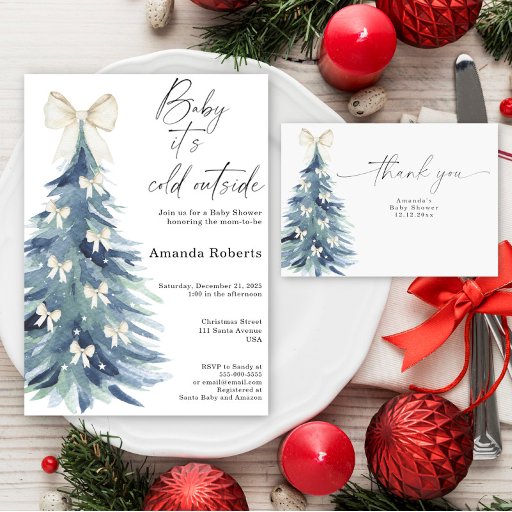 El diseño presenta un guión moderno de caligrafía, copos de nieve y árbol de acuarela. Elementos coincidentes disponibles.