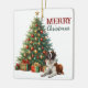 En la parte delantera de este adorno navideño se ve la imagen de un hermoso perro de San Bernardo tendido junto a un árbol navideño decorado con paquetes de regalo. El texto rojo y verde a un lado dice "FELIZ NAVIDAD". La parte trasera del adorno tiene la misma imagen, pero el texto dice "AÑO NUEVO FELIZ". El texto puede ser personalizado para que algo más, si lo desea.