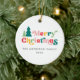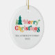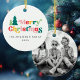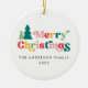 Ornamento redondo de cerámica con el texto "Feliz Navidad" en color, fuente retro y nombre familiar y año de personalizable. En la parte posterior hay una plantilla para la foto de su personalizado.