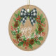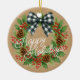 Este adorno de árbol de vacaciones de bonito diseño exhibe una elegante pintura acuarela de una corona adornada con un arco a cuadros de búfalo blanco y negro, pinecones, hojas verdes de hueso, bayas rojas y agujas de pino. Su elegante y rústico diseño capta la esencia de la temporada de vacaciones de diciembre y atrae a los que aprecian los ilustraciones artísticos. El ornamento ofrece opciones de personalización que le permiten personalizarlo con el nombre de su empresa, el nombre de su familia o los nombres individuales en la parte posterior, e incluye un poema de bienvenida de temporada a medida, lo que lo convierte en una opción muy cuidadosa para difundir alegría por las vacaciones.