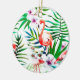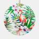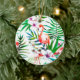 Una obra de arte tropical con flamencos rosas y plantas verdes de selva tropical con flores de hibisco y palmeras sobre un fondo blanco neutro. Una divertida y colorida obra de arte.