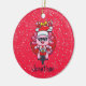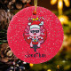 Disfrute de este divertido diseño de Navidades lindos con un adorable axolón rosa con una gran sonrisa y gafas de sol usando un gorra de Santa Claus. Está montando una motocicleta con una bolsa de juguetes y artículos para los niños. El fondo es rojo con puntos nevados y sutiles copos de nieve. Personalice agregando un nombre. A los niños les ENCANTARÁ este adorno con la popularidad de los axolotes. Hace un gran regalo para las vacaciones. Va bien en otros ornamentos y productos. Feliz Navidad!