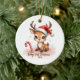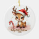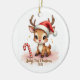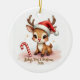 Commemorate baby’s very first holiday with this darling keepsake! A sweet little reindeer fawn wearing a tiny red Santa hat sits by a candy cane and beams with big, sparkling eyes. Soft blush pinks and snowy sparkles surround the words “Baby’s First Christmas 2025” in whimsical script.
