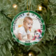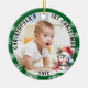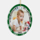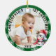 Ornamento único para la primera Navidad del bebé con foto, nombre y año personalizado. Está decorado con un pingüino adorable con un muñeco de nieve pequeño, copos de nieve y un marco verde. El diseño es el mismo en ambos lados.