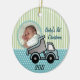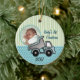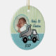 El primer Navidad de bebé adorno con fotos gemelas. Camión de volcado con rayas y puntos de polka con texto de personalizable.