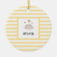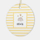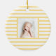 Elegante, moderno y adorable adorno redondo de fotos de bebés con un patrón de rayas amarillas. Esta plantilla presenta un adorable ilustracion de un bebé dinosaurio rosado durmiendo bajo las estrellas doradas amarillas con el nombre del personalizado Baby. Genial tanto para el niño como para el chica. ¡Un regalo perfecto para todas las temporadas!