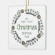 Celebra la primera Navidad del bebé con este adorno de sake, con una corona de arte folclórica al estilo escandinavo de vegetación y flores garabateadas. La palabra "Navidades" aparece en verde. Personalice el ornamento con el nombre del bebé y el año con el tipo de letra sans serif negro.