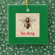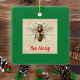 Esta abeja quiere desearte una Feliz Navidad. Este diseño presenta una abeja sobre un fondo de panal de miel, con la frase "Bee Merry" debajo. El fondo es un verde festivo.