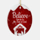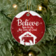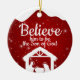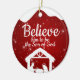 Berry Red Sparkle Winter Wonderland Worship Ceramic Ornament. Christmas Religious Holiday Decor. Infuse your divine inspiration through this captivating design, perfect for nativity Scene enthusiasts, shimmering with a light snowfall background, enhanced by a serene snow-cap. A pristine white nativity scene shines at the heart, along with the empowering words: "Believe Him To Be The Son of God." The back mirrors this enchanting snowy effect, featuring a Bible verse Design in customizable faith text: "And this shall be a sign unto you; Ye shall find the babe wrapped in swaddling clothes, lying in a manger Luke 2:12" scripture. Customize to suit your style, making it a cherished Christian festive keepsake or a meaningful seasonal Xmas gift. Ideal for sharing a Holy Message during the holidays—personalize on Zazzle now and elevate your celebrations!