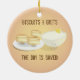 Ornament with a plate of smiling biscuits and a happy bowl of grits. The words “Biscuits and Grits the day is saved!” are part of the design and can be customized.