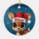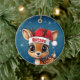 Blitzen! Celebrate the holiday season with this festive round ceramic red ornament featuring an endearing woodland forest animal cartoon graphic of a cute baby reindeer wearing a Santa hat. Perfect deer with antlers for decorating your tree or as a thoughtful gift, this whimsical doe decor makes a cherished keepsake for years to come. Customize by changing the text, the font, the font color, or remove the text. You can even transfer this design onto other products. Enjoy this design your way! 🎄🦌