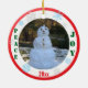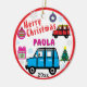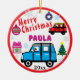 Festive Merry Christmas written in red snowcapped typography. Name in pink for for girl. Insert Year in black. Peace Joy green typography on backside of two-sided item with snowman image, or Upload Your Own Photo. Whimsical snowflakes, decorated yellow star tree, gift box and ornaments, and fun sky blue white and red yellow cars. Original Photography and Design by TamiraZDesigns.