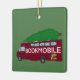Cuenta con un ilustracion de un libromóvil festivo. El vehículo rojo oscuro está decorado con luces Navidades y tiene un árbol de Navidad en el techo. En la parte posterior de este ornamento hay un punto para añadir su propio mensaje personalizado en escritura blanca o cursiva.