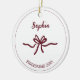 Adorno de cerámica blanco con lazo de Borgoña, nombre de dama de honor y año es un recuerdo elegante y atemporal que añade un toque de sofisticación a cualquier regalo de dama de honor. Este adorno presenta un diseño limpio y minimalista con fondo blanco, mostrando un delicado lazo de borgoña en el centro, rodeado por una línea sutil de borgoña. El nombre personalizado en letra script encima del lazo añade un toque único y sincero, mientras que la palabra "dama de honor" y el año personalizado debajo del lazo marcan el papel especial que jugaron tus damas de honor en tu boda. Este adorno personalizado es un regalo reflexivo y sentimental, perfecto para celebrar el apoyo y la amistad de tus damas de honor durante tu camino hacia la boda. Es ideal para añadir un toque personal a tu decoración navideña, creando un recuerdo único que puedan atesorar durante años. Ya sea que cuelgue en un árbol de Navidad o sirva como pieza de exhibición, este elegante adorno les recordará para siempre los momentos especiales compartidos.