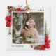 Un hermoso adorno de fotos de Navidades de moda rústica con tus fotos cuadradas favoritas (una a cada lado) rodeada por un delgado borde blanco con ramas de acuarela pintadas, boughs, flores rojas y conos de pino asomando por las esquinas. Personaliza con el año y tu apellido.