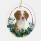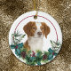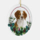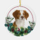 En la parte delantera de este adorno de vacaciones hay un hermoso retrato de un perro británico rojo y blanco que asoma a una masa sagrada y verde. Las bayas rojas y los conos de pino decoran los estribillos de pino y de caramelo. La imagen se coloca en un círculo blanco dentro de un círculo de líneas rojas delgadas. La parte posterior del ornamento tiene la misma corona de masa eververde y círculo con el texto personalizado en rojo.