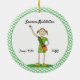 Nombre del personalizable, número de tropa y año para esta linda morena, júnior en cola de ponis con un uniforme verde y un sash, caja de galletas rojas, parado en el césped saludando. Un patrón cruzado verde bordea el adorno.