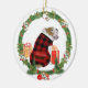 En la parte delantera de este adorno de vacaciones se muestra un bulldog marrón y blanco vestido con una capa de manto rojo y negro de búfalo. El abrigo tiene un emblema con dos imágenes de oso cerca de la cola, con el texto "Agujas del oso". El perro te está mirando sobre su hombro, y se sienta en un bonito de pino y corona de baya decorada con campanas de Navidad. La parte posterior del adorno está decorada con imágenes de la cintura roja, ramos de pino, la misma campana y un cardenal rojo. Su texto personalizado está en rojo y verde. ¡Qué lindo!