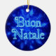 Un enjambre de copos de nieve fractales azules. El texto italiano que dice "Buon Natale" aparece en azul brillante y blanco.