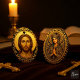 "This profound and richly detailed graphic is a striking religious icon portrait of Jesus Christ. The figure is set against a radiant golden halo and bordered by a magnificent, heavily textured 3D frame featuring intricate gold scrollwork and foliage, all beautifully contrasted against a deep teal or dark blue background. This design's luxurious and traditional feel makes it ideal for high-end wall art (canvas or wood prints), decorative prayer book or Bible covers, religious greeting cards for Christmas or Easter, memorial jewelry or tokens, or any product intended to express faith and spiritual art in a traditional and majestic style."