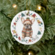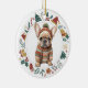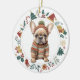 Este adorable ornamento Holiday presenta una acuarela de un adorable cachorro de Bulldog francés vestido con su suéter y gorra de invierno. La imagen está enmarcada en un círculo colorido formado por varias imágenes del día festivo, incluyendo un muñeco de nieve, campanas, caramelos, medias, ¡caramelos y más! La parte posterior del adorno tiene la misma imagen de corona con el texto de su personalizado en verde, oro y rojo. Ver más diseños franceses en Dog Village.