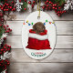 En la parte delantera de este adorable adorable adorable perro cachorro Labrador Retriever de chocolate con una bolsa de regalo de Navidades rojos y blancos. Detrás del perro hay una cadena de coloridas luces de Navidad. El texto de abajo dice "Feliz Navidad". La parte posterior del ornamento tiene la misma imagen con un campo de nombre personalizado.