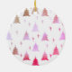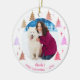 Personaliza este adorno de Navidad para celebrar la primera Navidad de tu perro. La plantilla está configurada para que añadas tu foto favorita de tu mascota, un nombre y el año. Tu foto está enmarcada con estrellas y árboles de Navidad rosados y dorados, en un fondo blanco de nieve. La parte posterior del ornamento tiene un patrón similar de árbol de Navidad. Busque en nuestra tienda estilos y colores alternativos