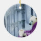 Oso polar con una casa morada sentada en una silla en el bosque, tomando una taza de café en una mañana nevada.