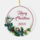 En la parte delantera de este adorno navideño se ve una imagen de un adorable perro de Cairn Terrier asomando a una masa sagrada y verde. Las bayas rojas y los conos de pino decoran los estribillos de pino y de caramelo. La imagen se coloca en un círculo blanco dentro de un círculo de líneas rojas delgadas. La parte posterior del ornamento tiene la misma corona de masa eververde y círculo con el texto personalizado en rojo.
