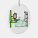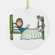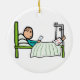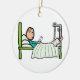El diseño de la cama del hospital muestra a un hombre pegajoso leyendo una tarjeta en la cama. Tiene una pierna rota en un elenco firmado levantado por equipo especial. El paciente tiene almohadas cómodas y una actitud relajada y resignada hacia una estancia hospitalaria. Get Well Soon!