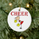 Una animadora con un uniforme rojo que vitorea y pompas amarillas y un texto rojo que lee CHEER en camisetas animadoras, tazas, tarjetas, bolsas de té, imanes, almohadas, ratones, ratones, ratones, periódicos y otras prendas y regalos animadores.