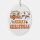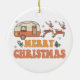 Camping Merry Christmas Reindeer Typography Ornament (Ornamento de tipografía de renos navideños) presenta el texto "Feliz Navidad" en una tipografía de escritura retro con una caravana decorada festiviblemente arrastrada por renos y acentuada con copos de nieve y holly. Diseñado por Evco Studio www.zazzle.com/store/evcostudio