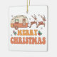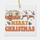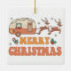 Camping Merry Christmas Reindeer Typography Ornament (Ornamento de tipografía de renos navideños) presenta el texto "Feliz Navidad" en una tipografía de escritura retro con una caravana decorada festiviblemente arrastrada por renos y acentuada con copos de nieve y holly. Diseñado por Evco Studio www.zazzle.com/store/evcostudio