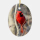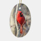 El luminoso cardenal rojo del norte golpea una pose sobre el adorno de cerámica. El pájaro rojo que atrapa los ojos le da un toque natural a la decoración de casa.
