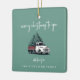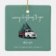 A festive Christmas tree ceramic ornament featuring the cheerful heading “Merry Christmas to you” in modern handwritten white script typography paired with a vintage-inspired Christmas tree delivery truck graphic. Designed on a forest green background, this stylish retro decoration combines nostalgic charm with a modern minimalist layout. Personalize the “with love from” section and underneath with your family name in complementary typography for a warm, custom touch. Perfect for decorating your tree, this fun and classic design adds personality to your home decor while spreading festive joy. A timeless Christmas ornament ideal for families, small businesses, or seasonal gifting.
