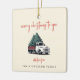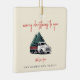 A festive Christmas tree ceramic ornament featuring the cheerful heading “Merry Christmas to you” in modern handwritten red script typography paired with a vintage-inspired Christmas tree delivery truck graphic. Designed on a vintage cream background, this stylish retro decoration combines nostalgic charm with a modern minimalist layout. Personalize the “with love from” section and underneath with your family name in complementary typography for a warm, custom touch. Perfect for decorating your tree, this fun and classic design adds personality to your home decor while spreading festive joy. A timeless Christmas ornament ideal for families, small businesses, or seasonal gifting.