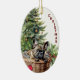 En la parte delantera de este adorno navideño está la imagen de un adorable Bulldog Francés acostado en su cama de cesta de mimbre frente a un árbol de Navidad decorado. Texto rojo curvo en el lado dice "NAVIDAD". En la parte posterior, texto rojo y verde dice "FELIZ NAVIDAD", y hay campos de texto adicionales para que puedas personalizar. ¡Haz que diga lo que quieras!