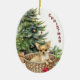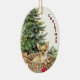 En la parte delantera de este adorno navideño está la imagen de un adorable perro Chihuahua marrón acostado en su cama de cesta de mimbre frente a un árbol de Navidad decorado. El texto rojo curvo al lado dice "NAVIDAD". En la parte posterior, el texto rojo y verde dice "FELIZ NAVIDAD", y hay campos de texto adicionales para que puedas personalizar lo que desees.
