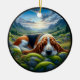 • This adorable Basset Hound in a beautiful setting makes a charming addition to your home or holiday decor.
