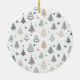 Chic white Christmas ornament gift with chic handwritten scrawl MERRY CHRISTMAS above your family photo collage of your 5 favorite 2025 pictures. The beautiful back features a pattern of hand drawn pine and fire trees. Modern elegant holiday present featuring one vertical photograph in the center and 4 square pictures on the sides.