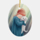 Una niña linda con un perro maltés o de Lasa blanco Apso. Con el pelo trenzado marrón anaranjado y un vestido azul. Los colores tienen algún azul, verde azulado, turquesa, verde, cal, naranja, púrpura. Pintura al óleo del arte de Digitaces de Donna Leger. Todos los derechos reservados.