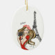 Este bonito diseño de adorno navideño de la Torre Eiffel presenta la torre Eiffel con un chica vestido rojo y un gorra. ¡Personaliza la espalda con un nombre y un año!