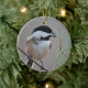 El chickadee negro-capsulado adorable se encaramó en una rama en un árbol de pino con una semilla de girasol
