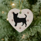 For dog parents, we love to include our furry kids in the holiday celebration or family event. This ornament with a silhouette of a Chihuahua is the perfect way to commemorate your beloved dog. Customize the back with your dog's name, titles, or your favorite saying. With a pattern of tan paw prints and blue dots on a beige background, this ornament is sure to please any dog lover or pet owner.