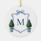 Trae un encanto intemporal a su decoración de vacaciones con este restaurante chinoiserie de árbol de topiario monogramado de Navidad. Con un árbol topiario acuarela decorado en arcos azules a cada lado de un escudo con su inicial personalizada, es un diseño clásico con un toque de adormidera. Cuelga en tu árbol de Navidad por un toque de tradición que se siente único en el tuyo, o dáselos a los seres queridos para que se mantengan atentos. Una hermosa manera de celebrar la temporada con estilo personal.
